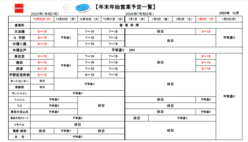 年始日程表R7~8年 いつも㈱光陽をご利用いただきありがとうございます。 年末年始、各店舗営業時間のご案内です。 ご利用のお客様にはご不便とご迷惑をお掛けいたし…